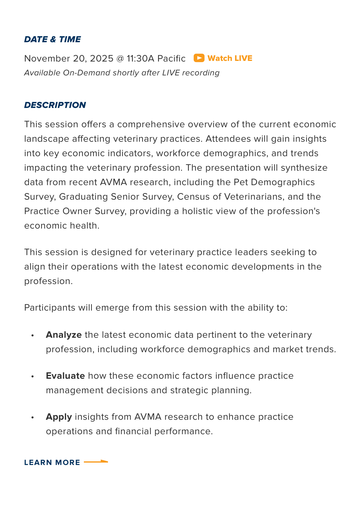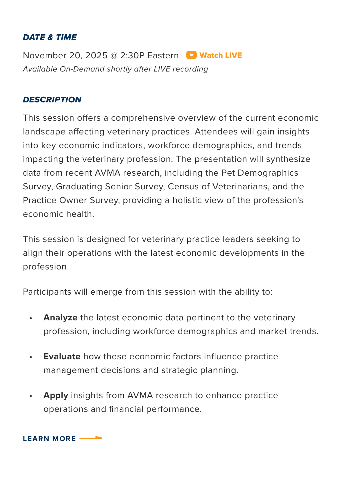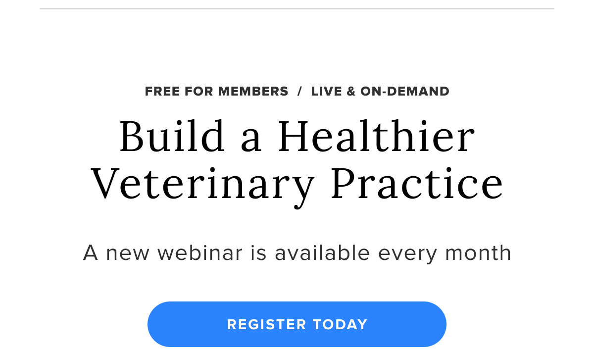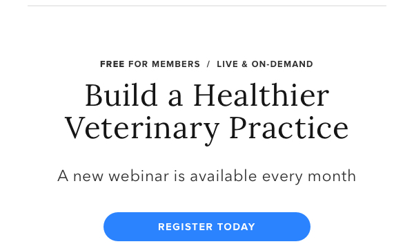 VMAE is proud to offer a well-established turnkey benefit that you can provide at no cost to your VMA members: the Veterinary Practice Health webinar series. These monthly webinars continue to deliver timely advice from industry experts on creating and maintaining a healthy veterinary practice. The VMAE Practice Health Committee consistently secures top-notch speakers for these valuable sessions.